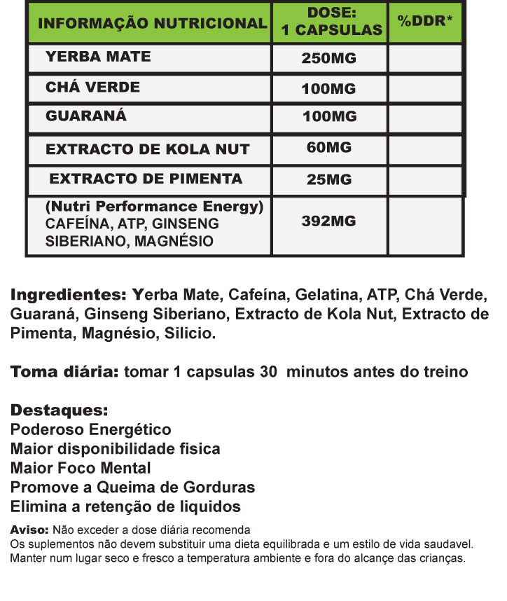 Pode também ser usado como pré treino graças às suas características energéticas e de aumento da predisposição para o treino.